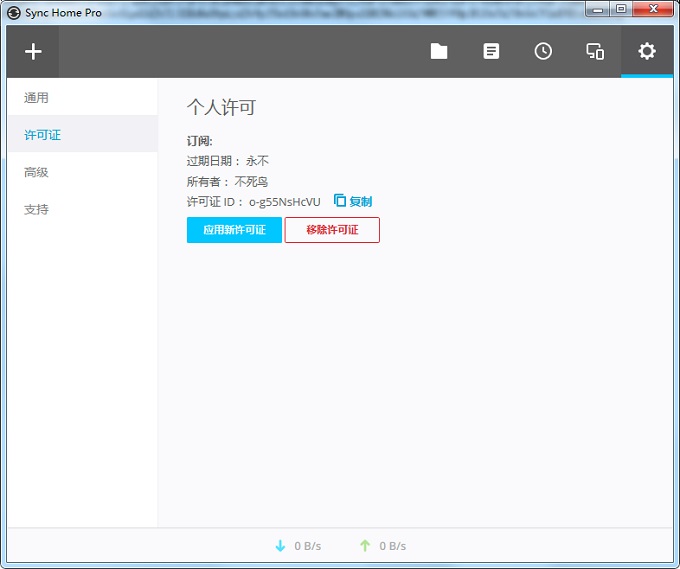 目前对所有版本有效,下载 Resilio Sync License 授权许可证解压得到.btskey 文件,点击试用,然后点击右上角的设置,在点击.btskey 许可证文件导入即可。